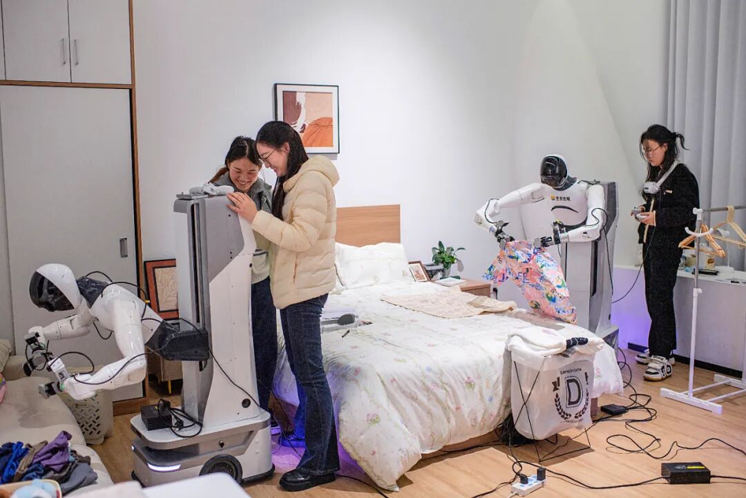 在仿真卧室场景区,训练师在交流训练机器人的心得。(朱熙勇|摄)