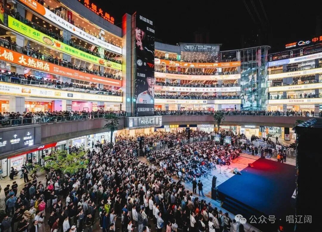 2025年10月14日,2025英雄联盟全球总决赛的战火刚刚燃起,光谷步行街便迎来了首个观赛高峰。从下午开始,人流便从四面八方汇入,在喷泉广场巨型LED屏下聚成一片人海。街道、楼梯、天桥,皆成观赛席。