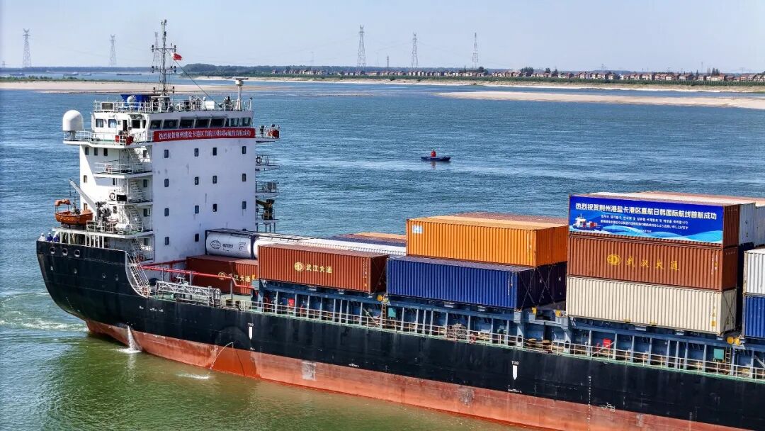 同年8月,荆州开通了直航日韩的国际航线,让万吨国际货轮历史性地驶入长江中上游,创造了长江内河港口通航的新历史,标志着荆州从“内河时代”向“通江达海”的新跨越。