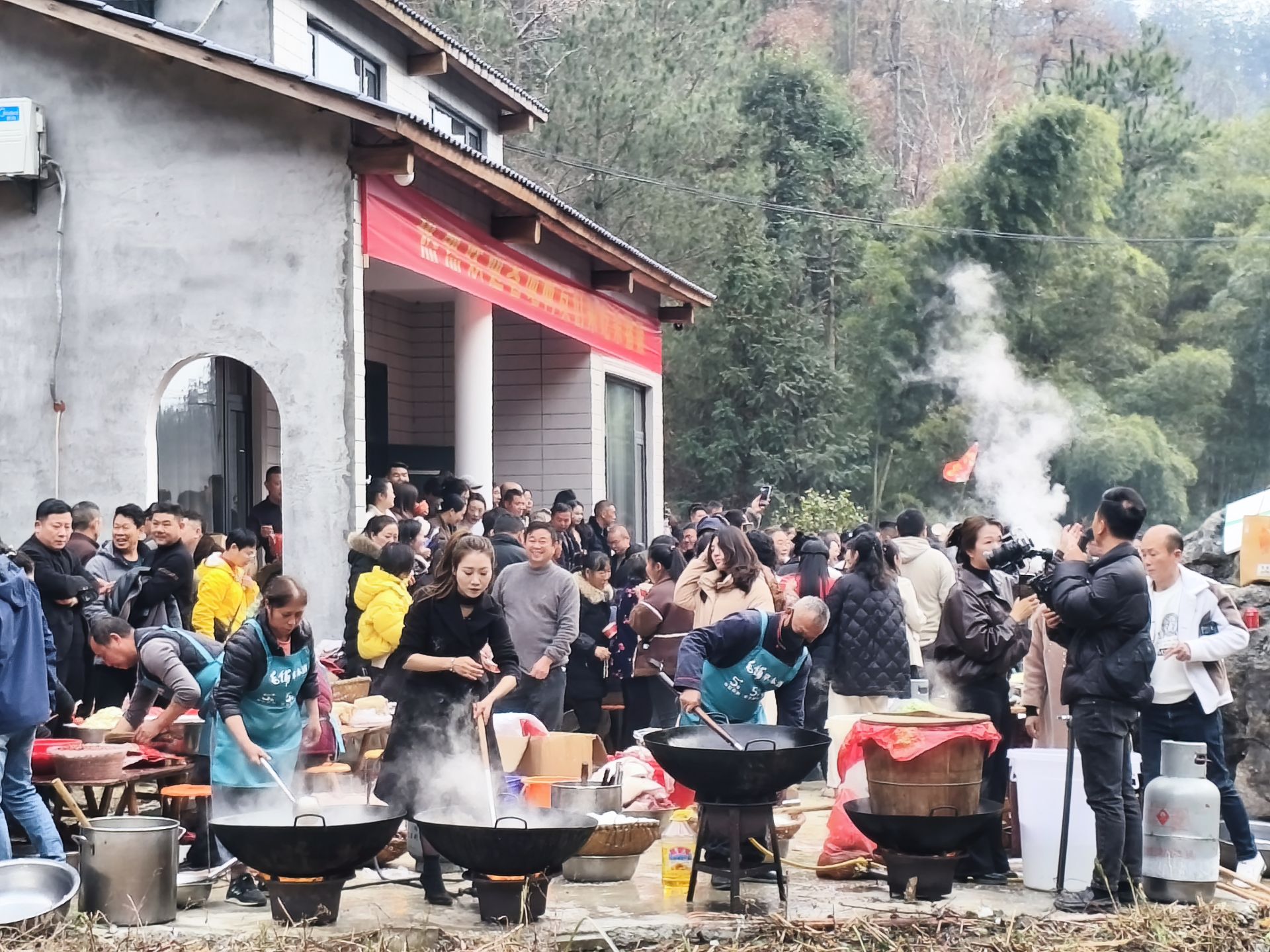 粗瓷碗筷的碰撞声、大铁锅里的翻炒声、天南地北的谈笑声,混着蒸腾的热气,搅热了整片山谷。