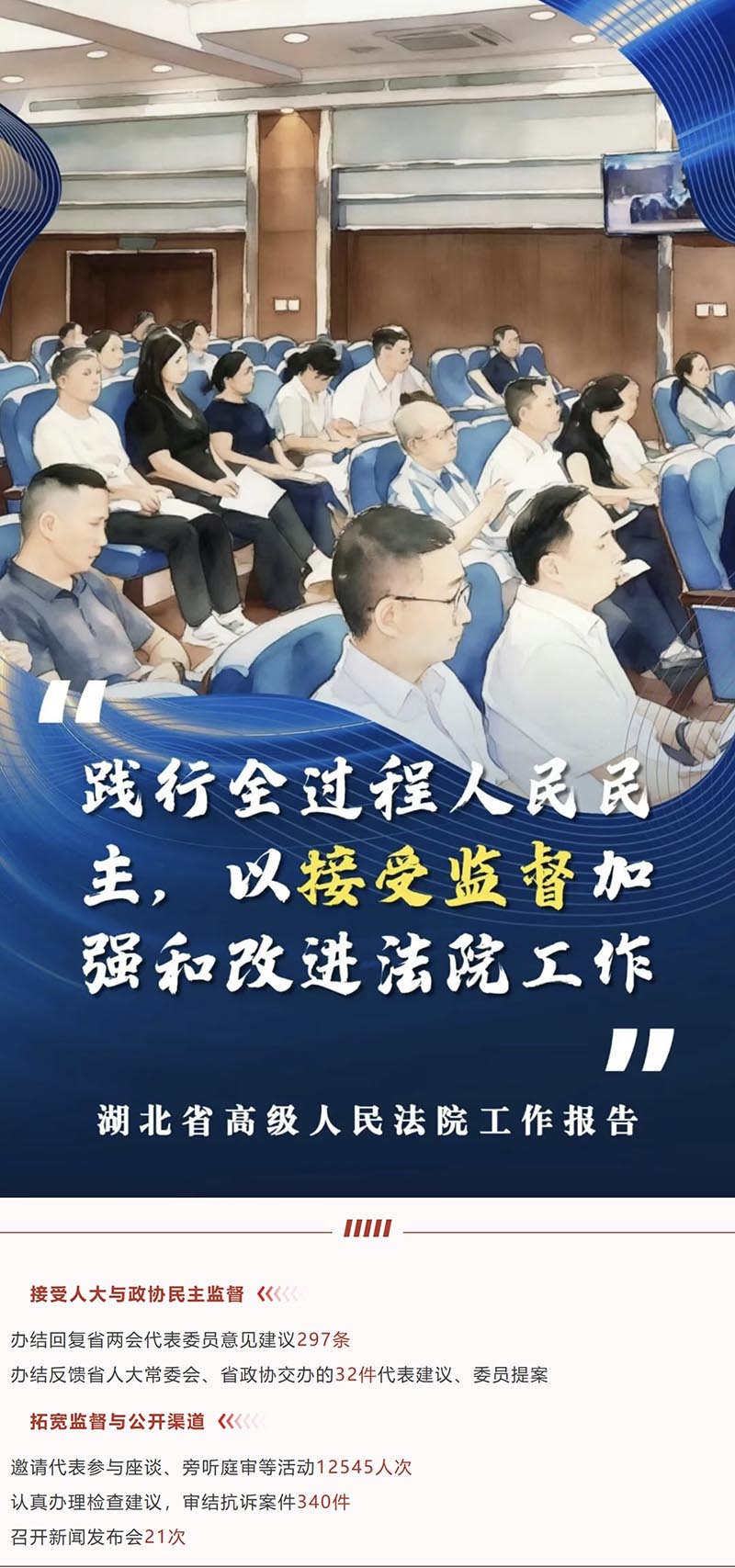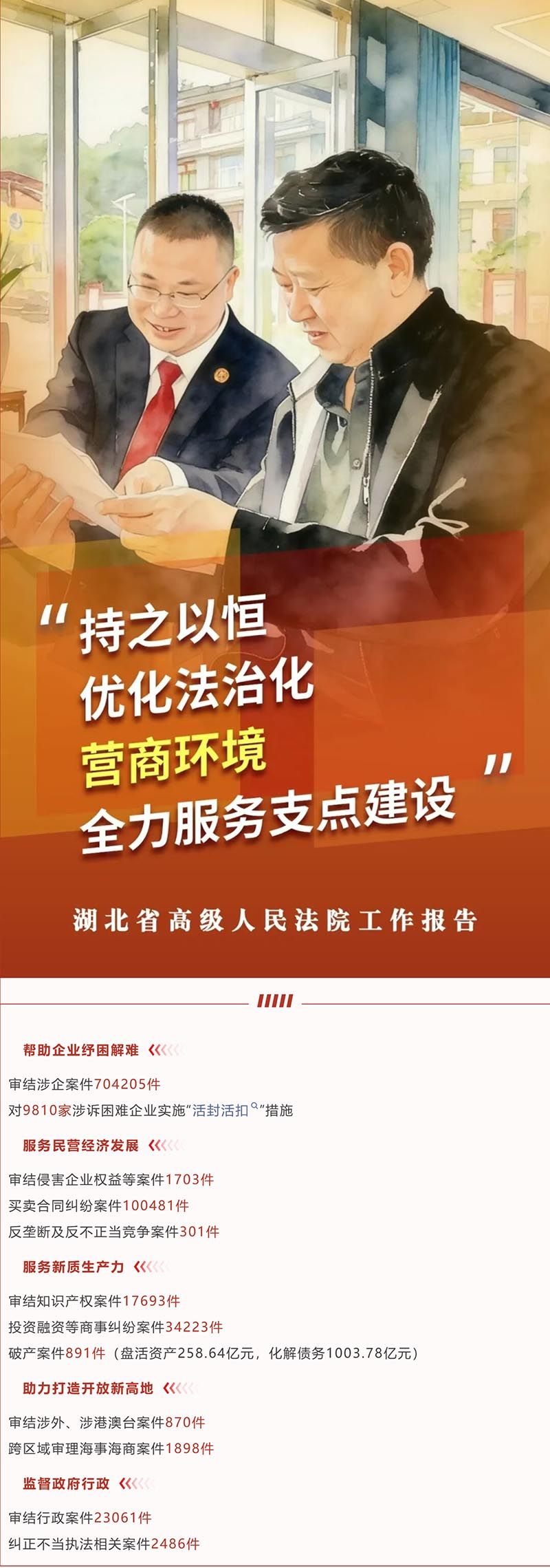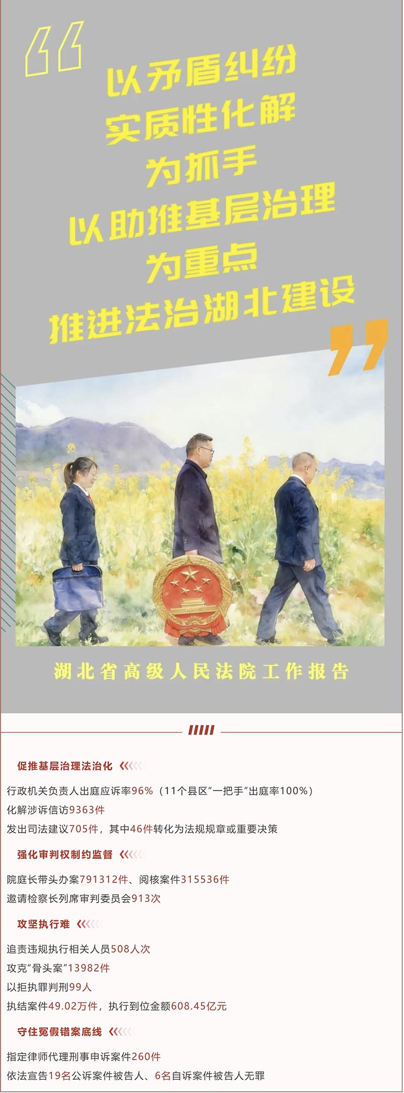 2026湖北两会丨数读湖北省高级人民法院工作报告 2026-01-29 16:10 0 1月28日,湖北省高级人民法院党组书记、院长游劝荣在湖北省第十四届人民代表大会第四次会议上作法院工作报告。游劝荣从持之以恒优化法制化营商环境、全力维护安全稳定、坚定不移推进长江司法保护、坚持人民至上民生为大、推进法制湖北建设、坚持强基固本、全面从严管党治警、践行全过程人民民主等方面,对过去一年湖北法院工作进行全面回顾和总结。(连迅、李晓笛、李佩熹) 来源:新华网