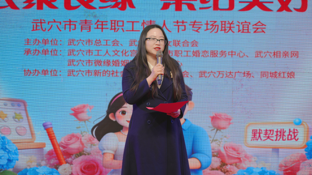 市总工会副主席王贤为活动致辞,她表示,广大青年职工扎根武穴、实干担当,以青春力量为城市高质量发展注入了蓬勃生机与不竭动力。青年职工的情感生活、婚恋需求与人生幸福,始终是工会作为职工“娘家人”的深切牵挂。本次活动旨在为广大青年搭建真诚、温馨的交友寻缘平台,希望青年职工们能够敞开心扉、主动交流、勇敢追爱,同时也期盼家长们当好子女幸福路上的暖心后盾,共同助力青年收获美好缘分与幸福人生。