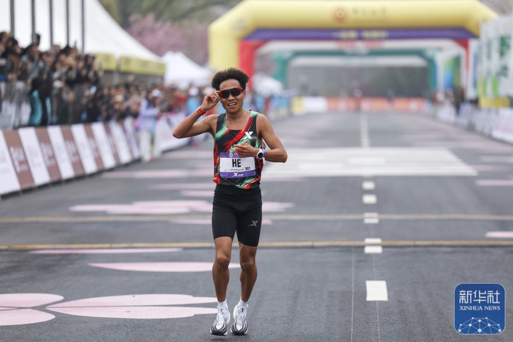 ↑ 肯尼亚选手穆鲁里到达终点,最终他以2小时10分16秒获得男子组冠军。 新华社记者 肖艺九 摄