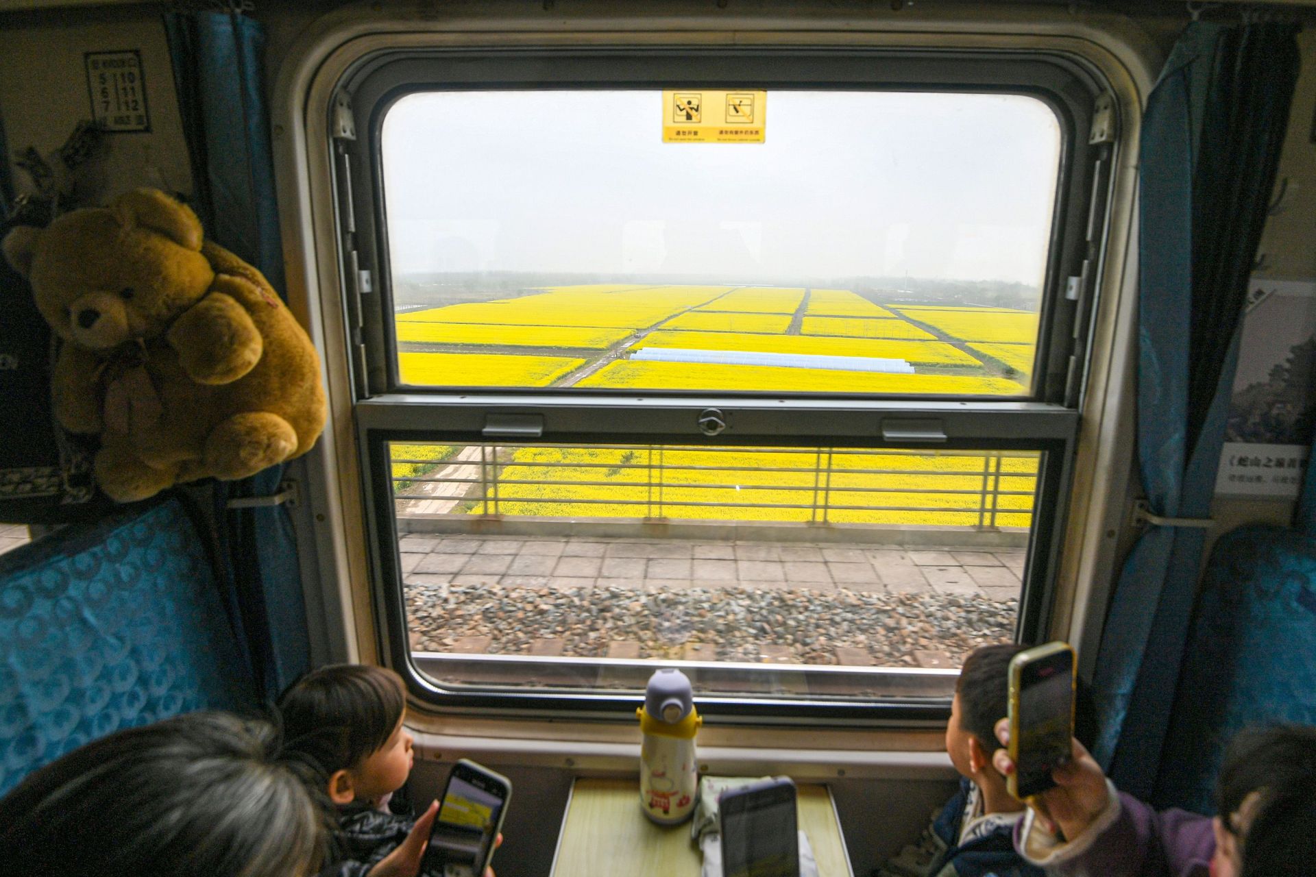 乘坐环线火车的旅客拍摄天兴洲油菜花。 记者史伟 摄