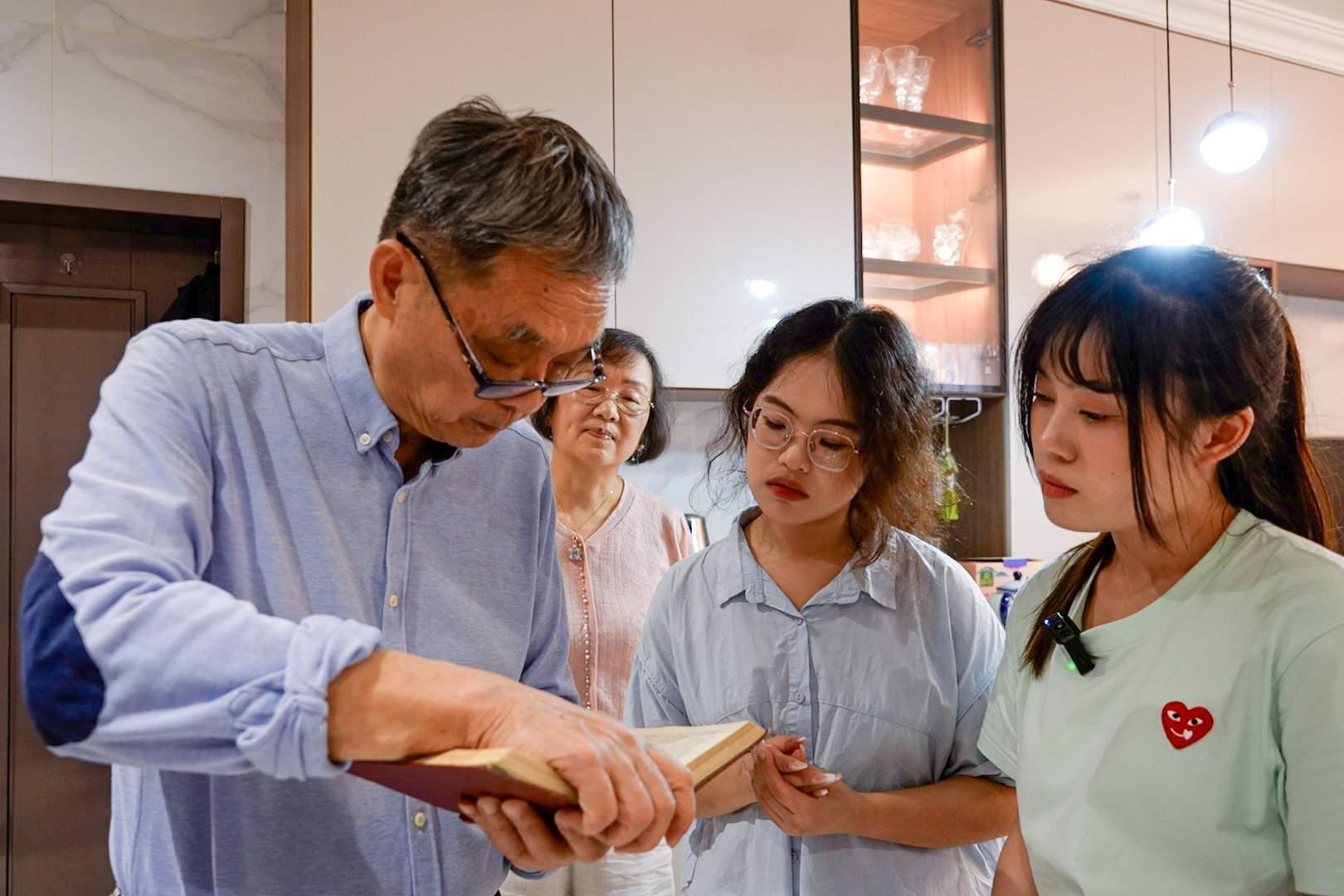 吴杰明(右一)向两名台湾女生讲述父亲吴壮达的手稿。记者杨佳峰 摄