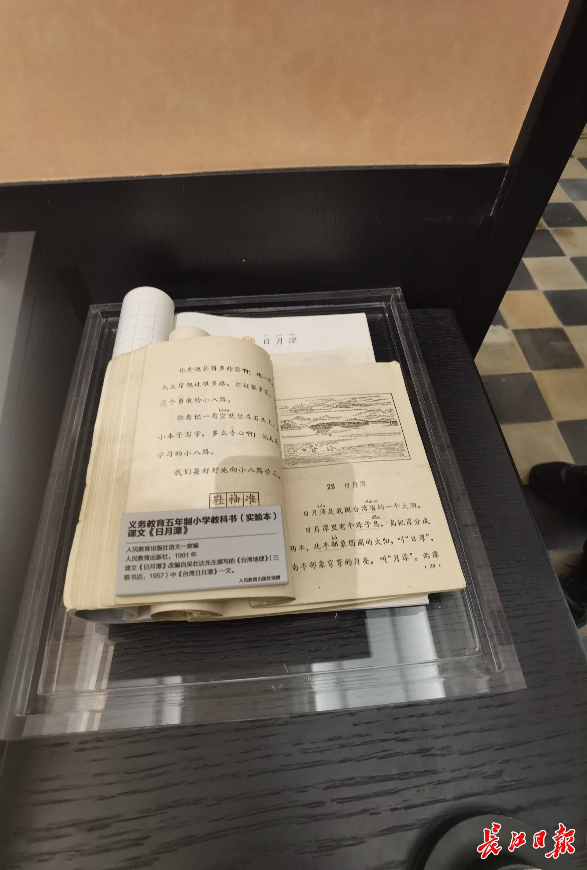王相平透过展柜玻璃观察,发现3个版本的课文略有不同。肖胜文介绍,《日月潭》首次入选教材是在1978年,改编自吴壮达撰写的《台湾地理》中《台湾日月潭》一文,第一版稍显简略。1991年,内容经进一步完善成为现在的版本,并标注了作者吴壮达的名字。