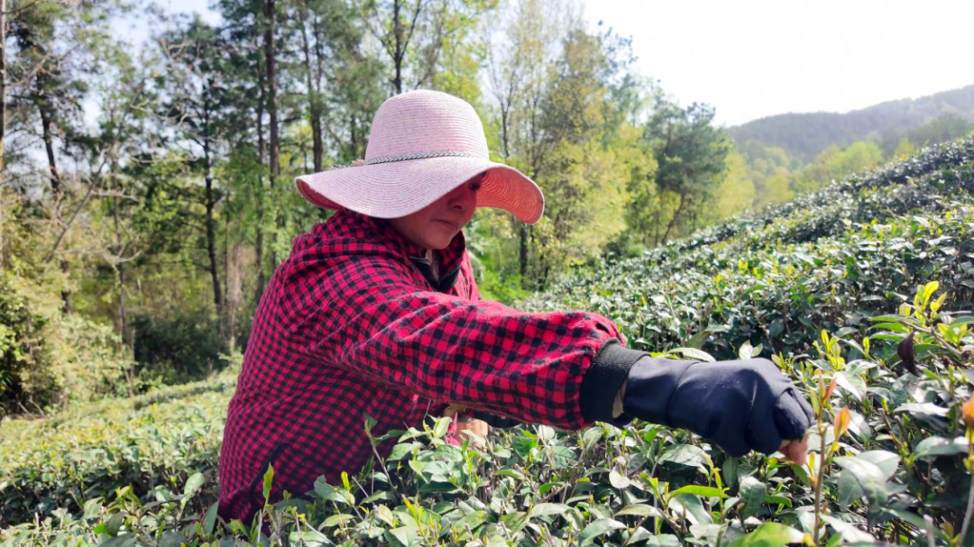 “我们一天能挣两百多块钱。现在茶园扩大了,交通也方便了,采茶的人越来越多,挣钱也方便。”城关镇九皇山村茶农张景香笑着说。