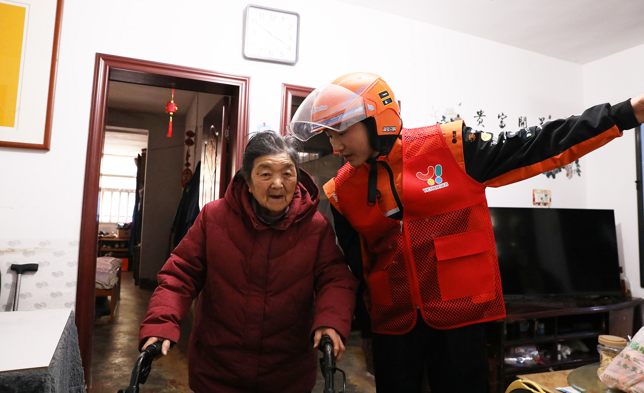 外卖小哥甄梦军告诉南苑社区唐奶奶,遇到困难可以随时打电话给他。记者 严晓冬 摄
