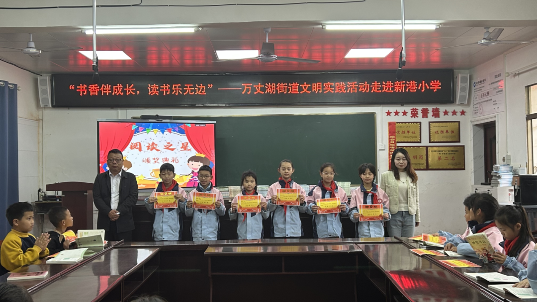趣味讲故事环节结束后,活动进入激动人心的颁奖环节。万丈湖街道文明实践所工作人员与学校老师共同为获奖个人和班级颁发奖状,一张张鲜艳的奖状,既是对孩子们阅读成果的充分肯定,也是对他们坚持阅读、涵养品德的莫大鼓励。此外,每位同学还领到了一本书籍,或是启迪智慧的《十万个为什么》,或是传递温暖的经典读物,进一步激发孩子们的阅读热情。