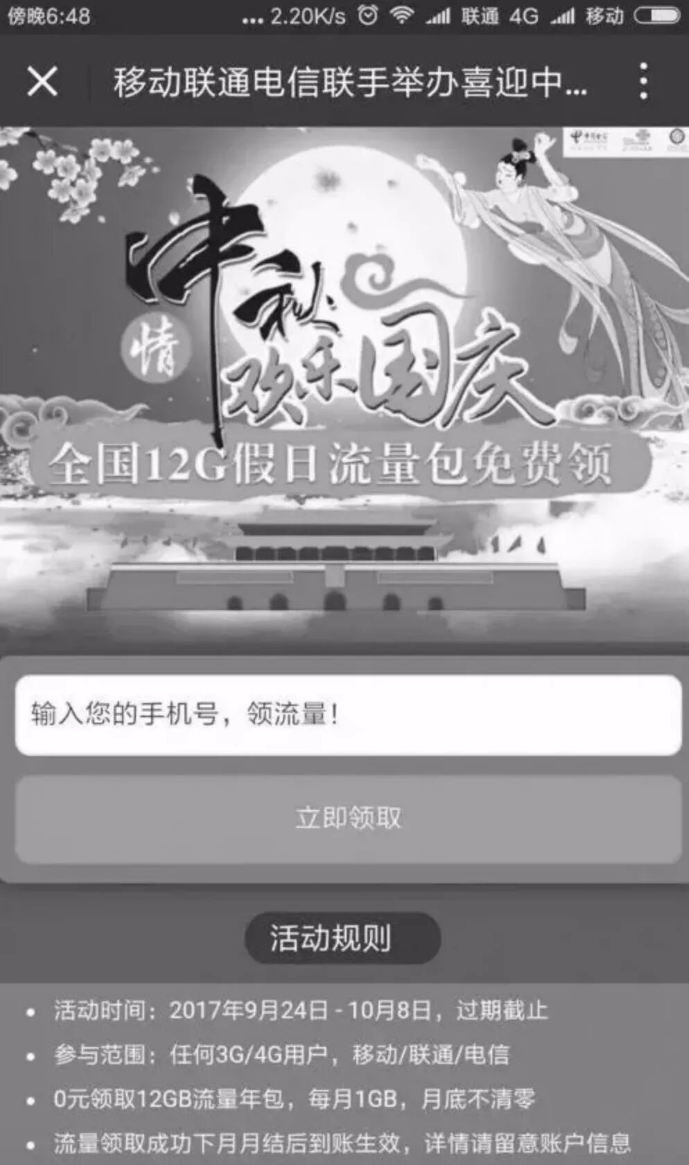 “移动、联通、电信联手举办喜迎中秋活动,2G流量免费领!”临近“十一”、中秋长假,这个看似“喜大普奔”的活动刷爆一些朋友的微信朋友圈,三大运营商联手发节日“福利”,这活动是真的吗?9月29日,沈阳网警辟谣,发“福利”的活动是假的。