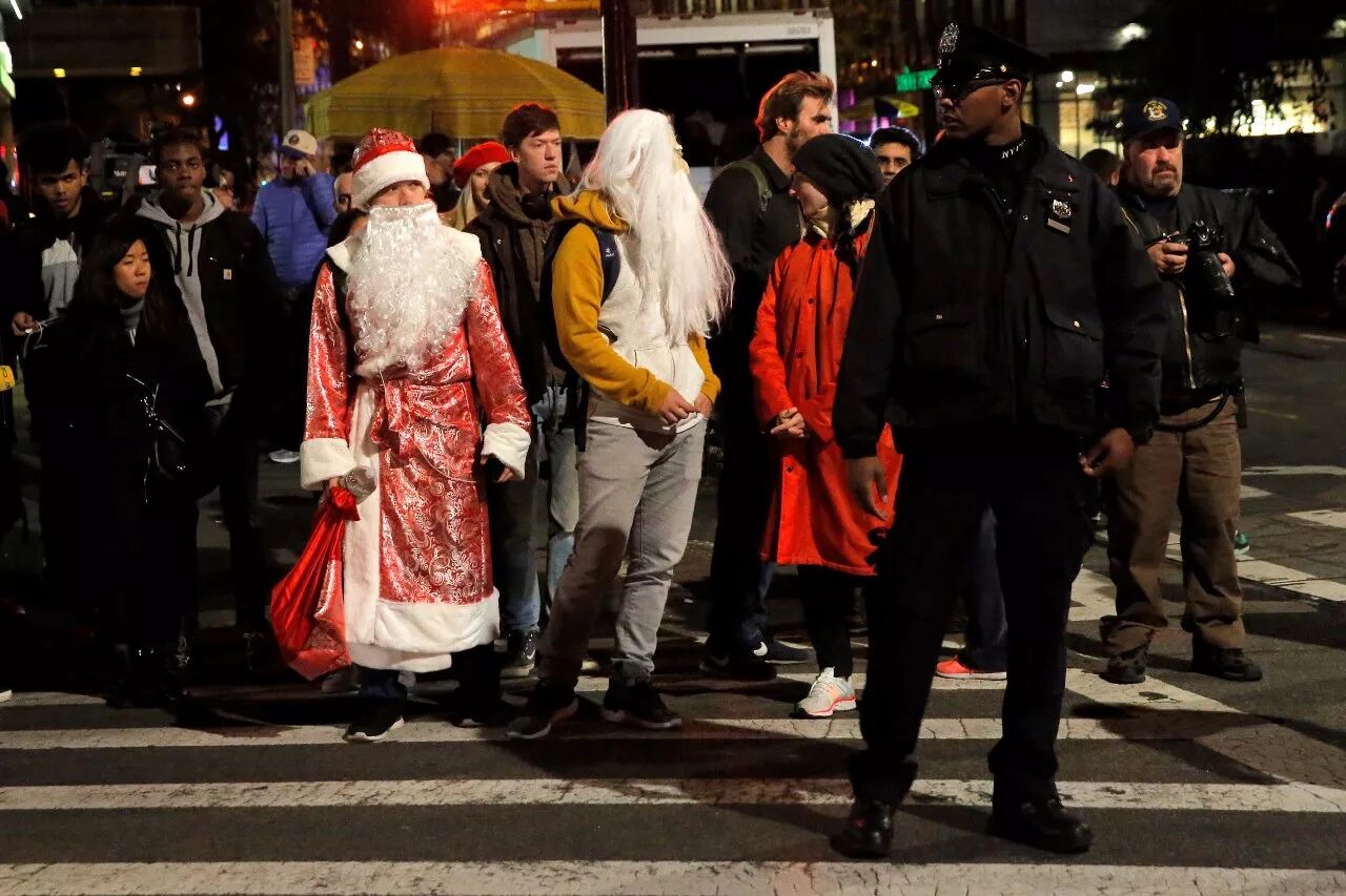 △纽约恐袭后警方封锁道路 人们在路障外等待参加万圣节游行