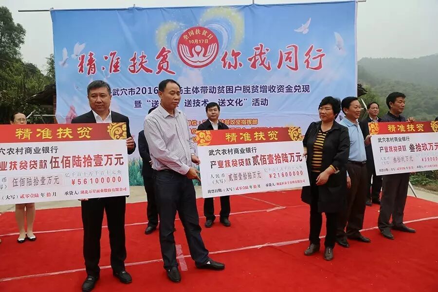 活动现场,市农商行向市场主体万星面业、恒泰羊、锐兴家庭农场共发放贷款816万元,湖北万星面业股份有限公司对在下赵村、同心村带动的38户建档立卡贫困户兑现资金约20万元。