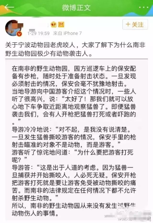 事件引发舆论热议后,一则帖子在朋友圈中流传,称“南非野生动物园极少有动物袭击人,因猛兽一旦开始撕咬人,保安会开枪把游客打死让游客免受痛苦,南非法律规定在任何情况下都不允许射杀野生动物”。
