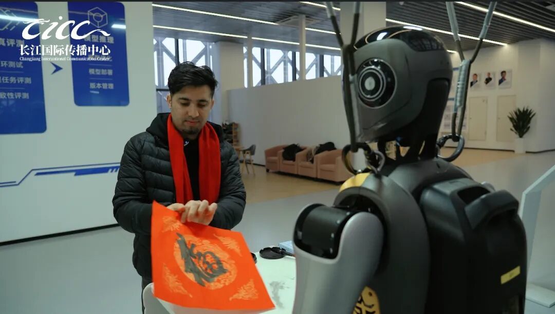 对武汉大学巴基斯坦籍博士生尤纳斯来说,“福”来自一个会写字的机器人。当人形机器人“光子”为他写下福字,他感受到的,是科技与传统的温暖相拥。