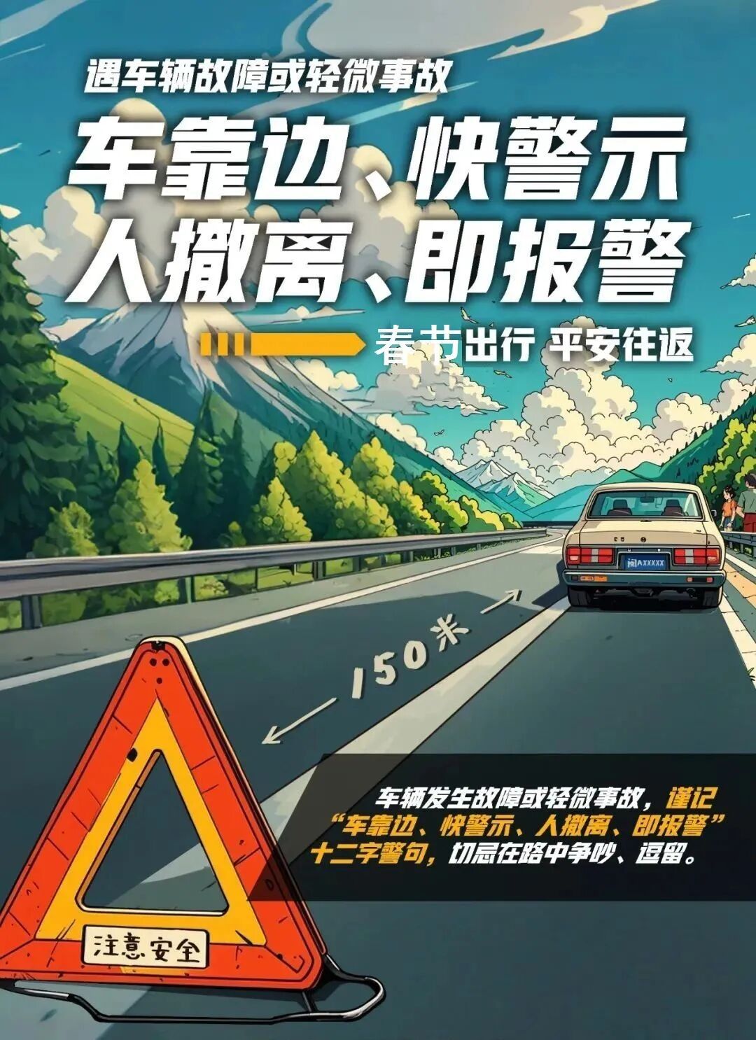 如车辆发生故障或交通事故,请牢记“车靠边、人撤离、即报警”,驾乘人员切勿在行车道上逗留,及时拨打报警电话。