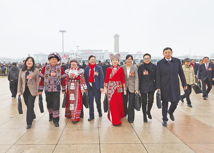 3月5日,十四届全国人大四次会议开幕会前,湖北代表团代表意气风发步入会场。(湖北日报全媒记者 张朋 蔡俊 摄)
