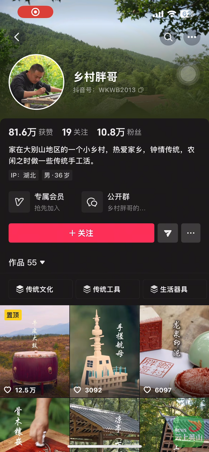 2024年5月9日,汪奎以"乡村胖哥"为名,正式发布了第一条短视频。从最初的生疏到逐渐熟练,他的账号专注记录各类手工艺品的制作过程,内容质感十足、地域特色鲜明。短短一年时间,粉丝数量突破11.8万。