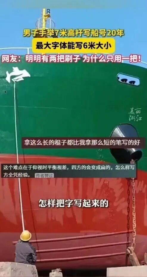现场实拍视频快速传播,洪本伟独创的船体长竿书法强势出圈。身居异地、扎根一线,这名普通务工的武穴人,不事张扬却身怀绝技,以强烈反差成为全网焦点。