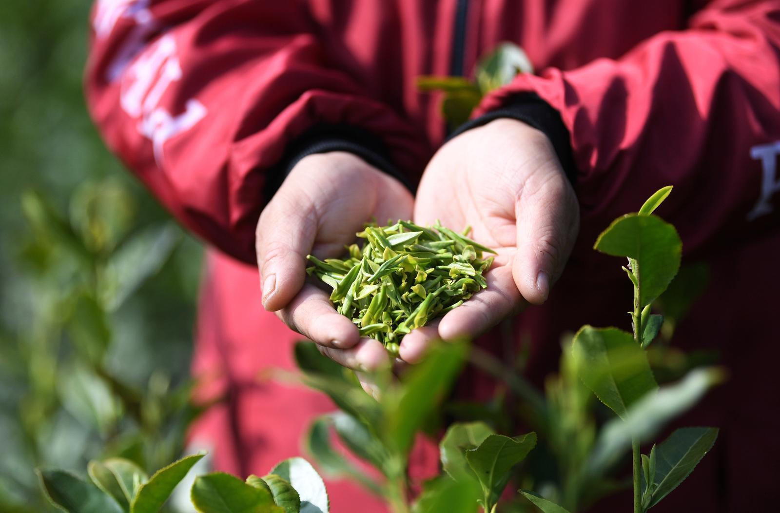 保康县城关镇罗仕沟村,茶农展示采摘的春茶。 特约通讯员 陈泉霖 通讯员 邢忆星 肖婕 摄