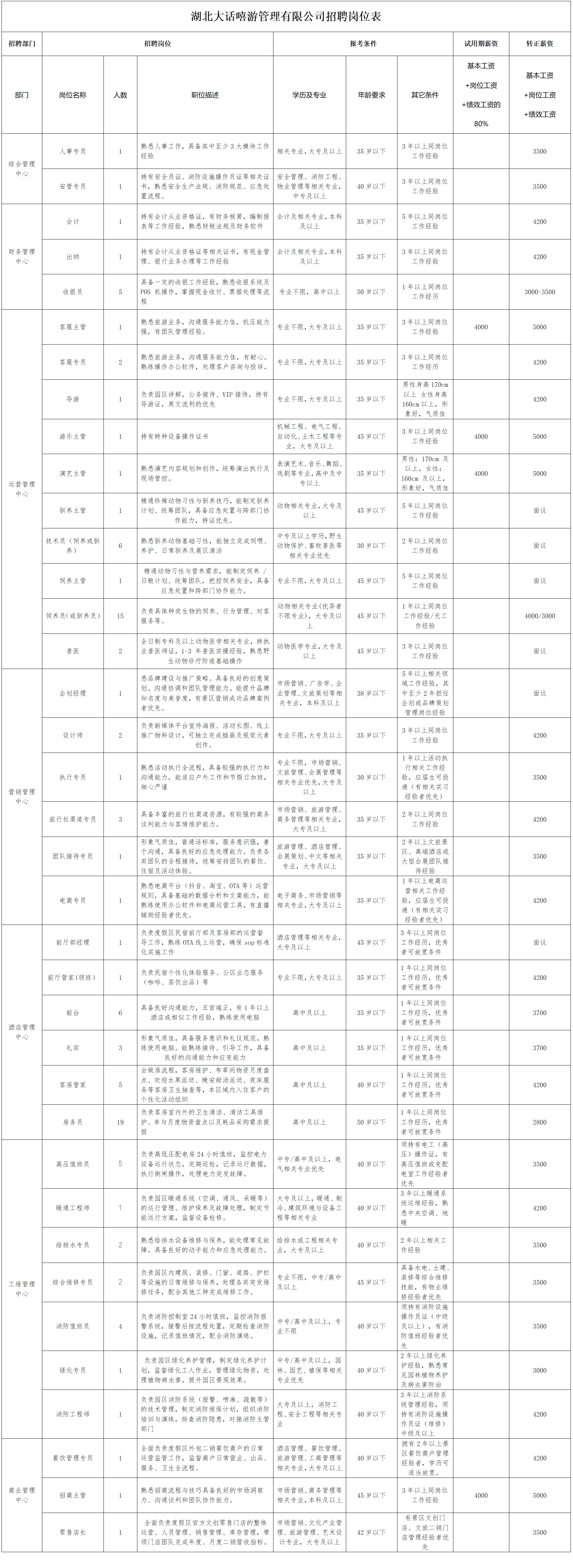 湖北大话嘻游管理有限公司是由武穴市农水集团文旅投资有限公司控股的省重点支持混合制文旅企业,公司打造的大话嘻游旅游度假区位于武穴市余川镇芦河村。为保障该项目顺利开园运营,同时带动群众就业增收,现面向社会公开招聘劳务派遣工作人员。具体岗位如下: